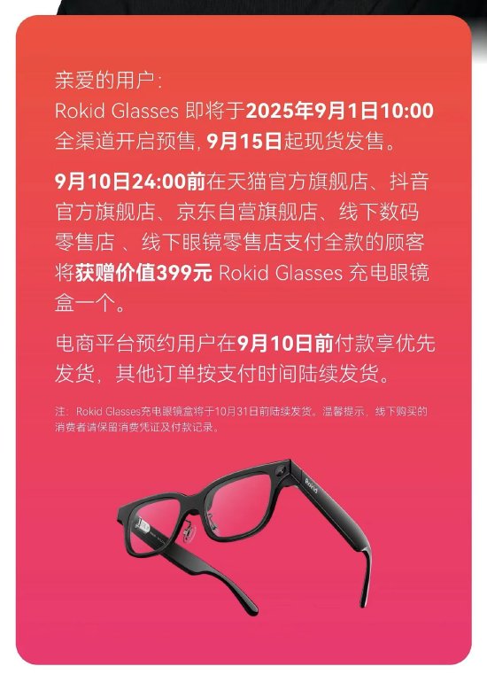 新浪科技讯 8月28日下昼音尘,Rokid当天文书九游体育娱乐网,Rokid Glasses 将于2025年9月1日10:00全渠谈开启预售,9月15日起现货发售。9月10日24:00前在天猫官方旗舰店、抖音官方旗舰店、京东自营旗舰店、线下数码零卖店、线下眼镜零卖店支付全款的顾主将获赠价值399元Rokid Glasses充电眼镜盒一个。